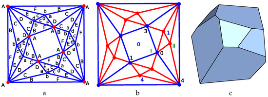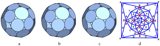 Figure 7a illustrates a partial labelling of the edge-hole contribution of each face. A figure showing the full graph is available in the Supplementary Materials. If we swap simultaneously b with d, B with E as well as C with D, we obtain the same p-cage after a reflection, so that to consider all values from 1 to 3 for the hole-edges parameters we must test 10,206 different configurations.