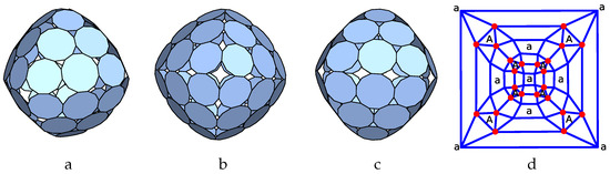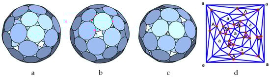 All the protein cages made experimentally so far are homogeneous symmetric. One difficulty is to guarantee that the nanocages that are generated are of a given geometry. For example the 24 and 12 ring TRAP cages were generated in the same experiment [20,22], with the type of buffer that allows for the generation of more of one type of p-cage rather than the other. Some 12-membered ring protein cages were also generated, in which a number of symmetric configurations with very similar deformations are possible [38]. This arose from the fact that the edges of the rings are all identical and capable of linking with any other rings. To be more selective one could use different protein rings to constrain the possible linking between them. This leads us [39,40] to define bi-symmetric p-cages as p-cages made out of two face families such that for any pair of faces belonging to the same family, there is a rotation automorphism of the p-cage, which maps one face onto the other, such that every face of a given family is mapped onto a face of the same family. A bi-symmetric p-cage can be homogeneous if it is made of a single type of polygon, but most of them are made out of two different polygons, one from each face family.