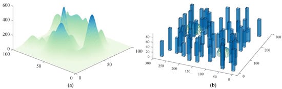 where n means the total number of mountain peaks; denotes the central coordinates of the -th mountain peak; is a parameter of the terrain and controls the height of that particular peak; and and , respectively, signify the attenuation magnitudes of the -th mountain peak along the x-axis and y-axis, which control the slope of the mountain.
