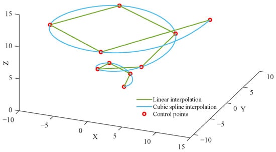 In the selection of boundary conditions, the default not-a-knot boundary condition of the spline function in MATLAB R2022a is employed. This boundary condition ensures the overall smoothness of the curve while maintaining the continuity of higher-order derivatives near the endpoints, thereby enabling a more natural and seamless transition of the curve at the endpoints. Figure 5 shows the routes generated by linear interpolation and cubic spline interpolation, respectively, and the latter better adheres to the kinematic laws of UAVs.