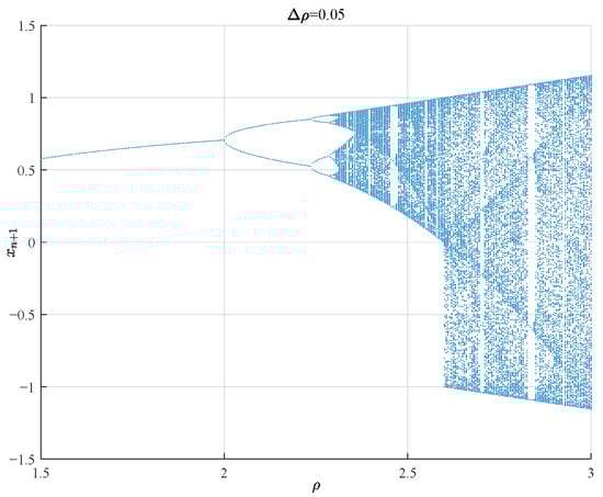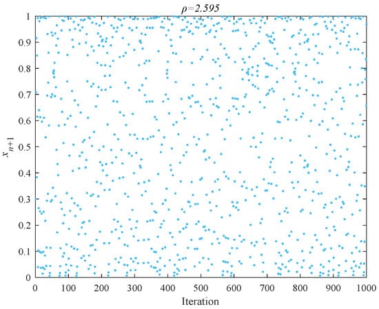 where is the mapping factor. Within a specific range of , the map exhibits chaotic characteristics. Figure 7 shows the bifurcation diagram of the Cubic map and when , where the iterative sequence demonstrates well chaotic ergodicity over the interval (0, 1), as shown in Figure 8.
