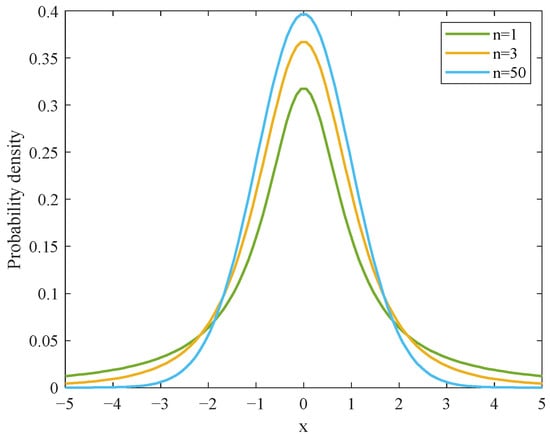 where is the degree of the freedom parameter, which affects the probability density of the t-distribution. When , the t-distribution turns into a Cauchy distribution; when approaches infinity, the t-distribution approaches a normal distribution. However, regardless of how the value of changes, the t-distribution maintains stable symmetry, as shown in Figure 9.