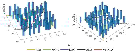 Since WOA and DBO performed well in the test set, the PSO, WOA, DBO, ALA, and MsIALA algorithms were simulated in the set environments based on the above parameters, and the results are shown in Figure 11. In the two mountainous area environments, as shown in Figure 11a, MsIALA chose to fly around following the mountain terrain. Although it sacrificed some flight undulation, the overall fitness value benefited from the shorter route length and outperformed the other four algorithms. As shown in Figure 11b, PSO, ALA, and MsIALA chose to fly around from the side. The smooth path and shorter route length enabled MsIALA to win. However, WOA and DBO, which flew around following the mountain terrain, had relatively large overall fitness values due to excessive flight undulation. In the two urban area environments, MsIALA was always able to find a relatively smooth delivery route and avoided obstacles by flying around the side of them.