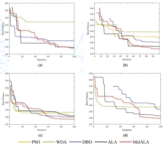 As can be seen from multiple sub-graphs in Figure 10a–d, in the initial stage of iteration, MsIALA decreased rapidly compared with other algorithms, indicating that the algorithm can quickly explore the solution space at the beginning. In the later stage of iteration, taking Figure 10e as an example, MsIALA can maintain a relatively stable decreasing trend in contrast to some other algorithms.