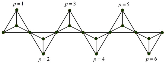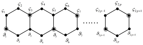 Consider a linear benzenoid structure that comprises p hexagons, as depicted in Figure 10. Let be the vertex set of . It is seen that . It is easily verified that if Let . Construct a dominating set , which is minimal will give . Therefore Suppose K represents a domination set, which is distinct from the minimum dominating set then . Hence if . □