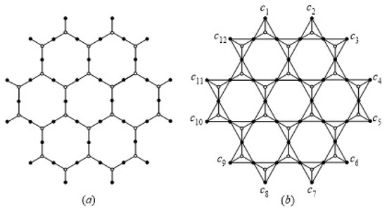 A silicate network, as outlined in ref. [12], can be created through various methods, one of which entails converting a honeycomb network into a silicate framework. To exemplify this transformation, let us consider the honeycomb network represented by , where p indicates its dimensionality. In this conversion process, silicon ions are initially positioned at each vertex of the honeycomb . Subsequently, every edge within the honeycomb structure is divided, resulting in the formation of new intermediate nodes. At each of these newly created nodes, oxygen ions are introduced. To enhance the structure further, additional pendant edges are incorporated. Each of these edges is connected to a silicon ion that originally had a degree of two in the honeycomb network. The terminal nodes of these pendant edges are filled with oxygen ions, thereby completing the tetrahedral bonding arrangement of the silicon atoms. In this arrangement, each silicon ion is bonded to three neighboring oxygen ions, resulting in a stable tetrahedral configuration characteristic of silicate materials. The resultant network is referred to as , signifying a silicate network of dimension p. This newly established structure exhibits a well-defined organization, with an overall diameter of , which denotes the maximum distance between any two vertices within the network. A visual illustration of a two-dimensional variant of this silicate network is presented in Figure 8a,b, providing a clear representation of the atomic spatial arrangement and the structural transition from a honeycomb lattice.