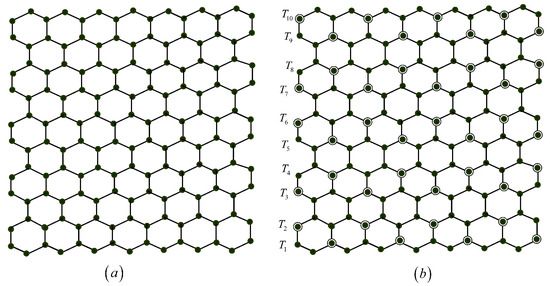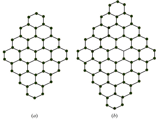 The prolate rectangle [32] is a pericondensed hexagonal system characterized by rows. In the row indexed by , there are p hexagons, while the row indexed by contains hexagons, where . In the row , the first hexagon is adjacent to the first and second hexagons of the preceding row . The structure of includes q rows of p hexagons and rows of hexagons. It is important to note that comprises horizontal zigzag paths, which are designated as from the bottom to the top of the rectangle. An illustration of the prolate rectangle is presented in Figure 14a, along with the minimal dominating set for depicted in Figure 14b.