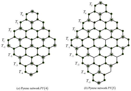 The pyrene [4] represents a network structure characterized by dimension p, consisting of rows of linear hexagonal systems. These systems are labeled as . The system is composed of p hexagons, whereas for each integer , both and contain hexagons. Figure 12 depicts the pyrene structures and . In scenarios where , the horizontal zigzag path at the base of is expressed as the sequence . Conversely, if , the horizontal zigzag path at the top of is denoted by . Figure 13 illustrates the minimum dominating set for the pyrene networks and .