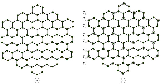To construct hexabenzocoronene , an additional layer consisting of six hexagons is added to the pre-existing honeycomb structure [32]. The upper nodes of these six hexagons are characterized as nodes of degree two. In , the total counts of nodes and edges are and , respectively. For a visual representation, see Figure 16a, which depicts a hexabenzocoronene structure , while Figure 16b gives its dominating set.