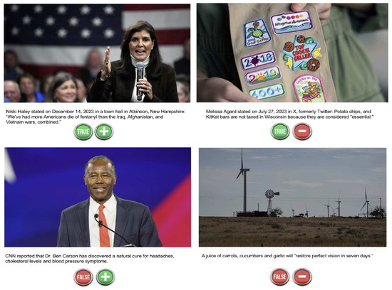News articles normally embrace plentiful text-based (such as titles, written content, etc.) and non-text-based (images, videos) information that allows in-field researchers to take advantage of such multimodal information for automatic fake news detection. However, existing multimodal approaches often suffer from an inherent asymmetry between textual and visual modalities: text encodes sequential, hierarchical semantics, while images capture spatially distributed patterns [16,17]. This asymmetry leads to mismatched abstraction levels and fragmented cross-modal interactions, limiting models’ ability to holistically reconcile complementary signals. Figure 1 demonstrates an example of four multimodal news samples from PolitiFact, where the four samples denote the four kinds of relationships between text and image in fake and real news, which are true positive (i.e., aligned text and image in real news), true negative (i.e., unaligned text and image in real news), false positive (i.e., unaligned text and image in fake news), and false negative (i.e., aligned text and image in fake news). In contrast to text-based unimodal fake news detection approaches, multimodal fake news detection models leverage images that contain visual cues aiding in assessing the credibility of the news. Moreover, images can provide additional context to textual information, which helps to identify discrepancies or inconsistencies in image–text pairs that might indicate potential misinformation or manipulation, thereby boosting the effectiveness of fake news detection [18].