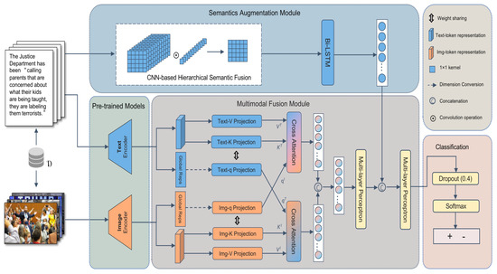 where denotes the hidden representation of text that captures the correlation between the global information of the text and the token-wise information of the paired image. In contrast, maintains the interactive information between images’ global representation and texts’ sequence information. Afterward, the two hidden representations, and , are concatenated for information fusion, as shown in Equation (9):