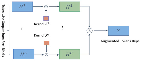 In the figure, the token-wise representations of 12 layers for a text sequence are treated as three-dimensional data that embraces 12 channels. The values of corresponding convolutional kernels are randomly generated and trainable. Each channel is used for convolution calculation, and then the outputs from all the channels are summed together as the return of the semantic augmentation module, where the result maintains the hierarchical semantic information. It is notable that the training progress of this module is also constrained by the decision label. Equation (10) reveals the calculation process of hierarchical semantic representation for text.