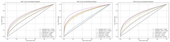 Effectiveness in task classification: SAFE-GTA achieved the best performance in almost all metrics on the three datasets. (1) Specifically, under the comparison on PolitiFact, SAFE-GTA had the highest accuracy (i.e., 0.888), indicating it is the most reliable method for classification between fake and real news. Moreover, the values of SAFE-GTA’s precision, recall, and F1-score were fairly high for individual fake or real news evaluation, which means that SAFE-GTA is quite adept at correctly identifying real or fake news. (2) SAFE-GTA again showed strong performance with the highest accuracy (i.e., 0.876) and precision on fake news evaluation (i.e., 0.903) on the Gossipcop dataset, which outperformed the second-best model, CAFE, by 0.5% and 2.8%, respectively. It had moderate precision and recall for real news but excelled with the highest F1-score for fake news (i.e., 0.927), which suggests a good balance between precision and recall in this category. (3) SAFE-GTA outperformed all other baselines in all metrics for the ReCOVery dataset, marking it the superior method for detecting both real and fake news in this context. The high accuracy (i.e., 0.937), precision (i.e., 0.936 on average across fake and real news), recall (i.e., 0.814 on average), and F1-score (i.e., 0.86 on average) indicate that SAFE-GTA was very effective at generalizing its detection capabilities on this dataset. As shown in Figure 4, the proposed SAFE-GTA model achieved the highest AUC scores across all three datasets—PolitiFact (i.e., 0.905), Gossipcop (i.e., 0.933), and ReCOVery (i.e., 0.821). The consistently significant AUC values quantitatively validate SAFE-GTA’s superior discriminative capacity in separating real and fake news across diverse classification thresholds. As the AUC evaluates the model’s ability to balance true positive rates (TPRs) and false positive rates (FPRs) at all decision boundaries, these results confirm SAFE-GTA’s robustness against threshold variations—a critical advantage for real-world deployment where optimal thresholds are often dataset-dependent. Notably, SAFE-GTA’s AUC surpassed those of all baselines (e.g., +1.0% over CAFE’s on PolitiFact and +3.1% over Gossipcop’s), underscoring its generalized superiority in multimodal fake news detection.