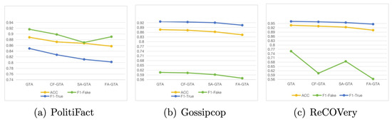 Figure 5 clearly depicts the results yielded from SAFE-GTA and its variants in terms of accuracy and F1-score for either real or fake news on three datasets. Also, it helps to understand the contributions of the components to the performance of the original SAFE-GTA. To better highlight the implications of the ablation study, we provide the following viewpoints by observing and analyzing the results from the figures.