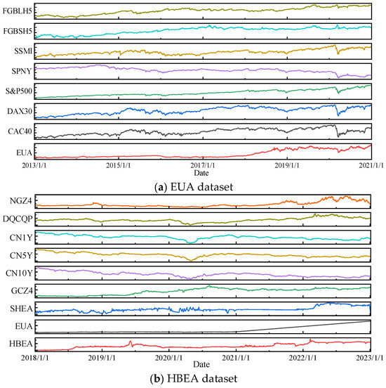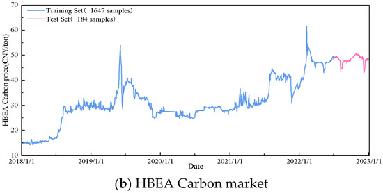 The European Union Emissions Trading System (EU ETS), as the world’s largest carbon market, exerts a significant influence on other carbon markets globally. To evaluate the performance of the proposed model, historical short-term carbon price data from the EU ETS are used as the benchmark. Due to the absence of spot carbon trading on the European Climate Exchange, this study employs the daily settlement prices of European Union Allowance (EUA) futures, excluding holidays, as the target for carbon price forecasting. The data span from 1 January 2013 to 1 January 2021. To further assess the model’s applicability and robustness in the context of China’s carbon market, this study includes an analysis of Hubei Emission Allowance (HBEA) prices. Since its pilot launch in 2014, the Hubei carbon market has matured significantly, with a large market scale and comprehensive data availability. In 2023, it recorded the highest trading volume among all regional markets in China, making it highly representative. Accordingly, this study selects the daily closing prices of the HBEA, from 1 January 2018 to 5 January 2023, for empirical analysis to evaluate the model’s predictive capability and application potential within China’s carbon market.