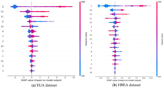 Carbon prices are influenced by a variety of factors, including energy, economic, and environmental indicators. A high correlation between two independent variables, known as multicollinearity, can be problematic because it can inflate the variance of the model’s coefficients, making the model less stable and interpretable. Detecting and addressing multicollinearity through techniques like variable selection, dimensionality reduction, or regularization ensures that the model is more reliable and that the predictions are more accurate [30]. This study selects multiple relevant influencing variables and employs Pearson correlation analysis to quantitatively assess the relationship between these variables and carbon prices. To optimize the model’s input variables, the Extremely Randomized Trees (ET) method [31] is employed to assess the grey relational degree between each variable and both the EUA and HBEA carbon prices. By analyzing the SHAP (Shapley Additive explanations) values, the contribution of each variable within the ET model is quantified. This approach aims to evaluate the significance of external factors in driving carbon price fluctuations. The analysis results are presented in Table 3 and Figure 2.