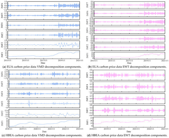 In this study, VMD and EWT are applied to decompose carbon price data from different carbon markets to enhance the prediction performance of deep learning models. As shown in Figure 4, VMD decomposes EUA and HBEA price series into six intrinsic mode functions (IMFs), effectively extracting frequency-specific features, reducing noise and mode mixing, and improving the model’s ability to capture trends and nonlinear dependencies—thereby enhancing both accuracy and robustness. EWT adaptively segments the frequency spectrum and generates seven and five physically interpretable IMFs for the EUA and HBEA datasets, respectively. These components precisely characterize high-frequency transient fluctuations caused by abrupt price changes and extract amplitude–frequency modulation signals, uncovering key patterns in carbon price dynamics. Particularly during periods of volatility, EWT enhances the time-frequency representation of signals. After decomposition, the original series exhibits more distinguishable trends, periodicities, and noise components. Compared to the raw sequence, these transformed components allow clearer identification and analysis of carbon price movements. Therefore, the multi-channel subcomponent matrices obtained via VMD and EWT are fed in parallel into the deep learning model, forming a frequency–time dual-driven feature space. This enables joint exploration of high-frequency details and low-frequency trends, providing rich multidimensional features for accurate carbon price forecasting under complex environments.
