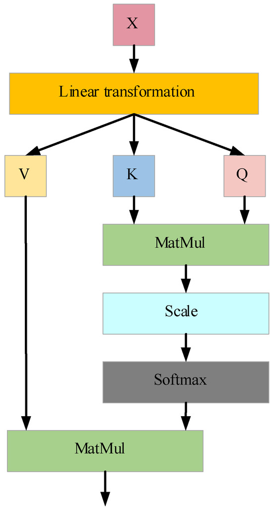 where , , and represent the query vector, key vector, and value vector, respectively; denotes the dimension of the key vector .