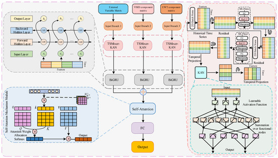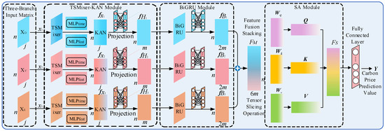 The proposed model employs a three-branch parallel input architecture. Each branch first applies time series modeling using TSMixer, which utilizes fully connected layers to facilitate interactions across both temporal and feature dimensions, thereby enhancing the modeling of temporal dependencies and feature representations. To further boost expressiveness, a Kolmogorov–Arnold Network (KAN) module is embedded within the temporal mapping layer of TSMixer. This allows for hierarchical nonlinear transformations across time and feature axes, enabling flexible extraction of high-order features. The transformed outputs are subsequently processed by a Bidirectional Gated Recurrent Unit (BiGRU), which captures bidirectional contextual information and strengthens long-term dependency modeling. Following this, a Self-Attention (SA) mechanism is applied to adaptively reweight and fuse features from all input branches. The fused representation is then passed through a fully connected layer to produce the final carbon price prediction. Through this multi-level feature extraction and fusion strategy, the model effectively enhances predictive accuracy for carbon price forecasting.