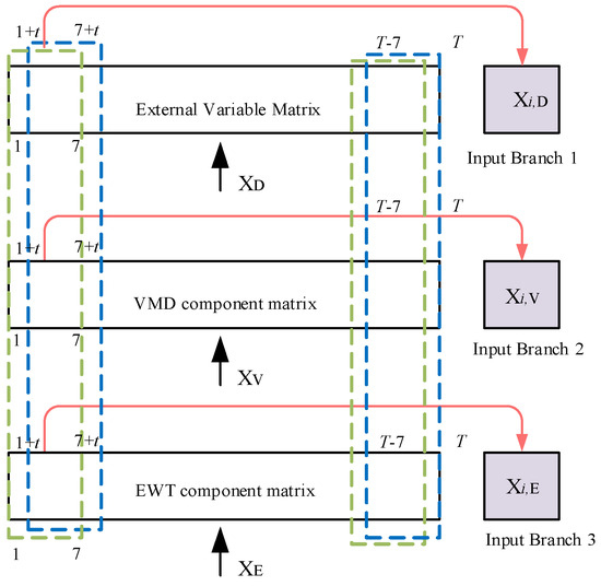 - The triple-branch input structure of the deep learning model integrates multiple information sources, enhancing adaptability to complex nonlinear data and improving forecasting performance. Specifically, the first branch preserves the integrity of the original data, capturing direct signals and the latent influence of external factors. The second branch utilizes Variational Mode Decomposition (VMD) to extract frequency-based components, aiding the understanding of data nonlinearity and non-stationarity. The third branch applies Empirical Wavelet Transform (EWT) to obtain intrinsic mode functions (IMFs) with clear physical interpretations, accurately characterizing high-frequency transient fluctuations due to price shocks and isolating amplitude and frequency modulation components.