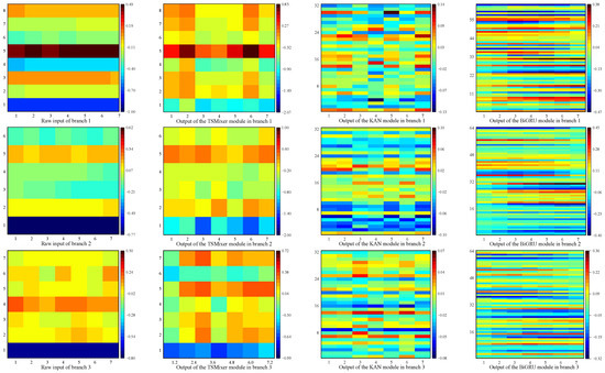 Taking the one-step prediction experiment on the EUA dataset as an example, the features extracted by each module from a single input are visualized using pseudo-color images, as shown in Figure 15. A comparative analysis of the visualized features from the three-branch structure reveals significant differences between the feature maps extracted from the carbon price subcomponent matrix—generated via the hybrid VMD + EWT decomposition—and those extracted from the external factor matrix. This demonstrates the effectiveness of the proposed scheme in capturing multi-scale features inherent in the carbon price data. Under optimal parameter settings, the features extracted by the different modules exhibit considerable variation, indicating that the sequential arrangement of submodules contributes to feature complementarity. This, in turn, provides valuable references for the Self-Attention (SA) module to effectively focus on key temporal features.