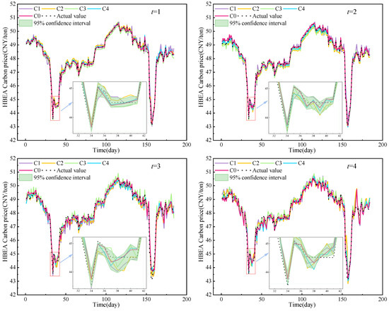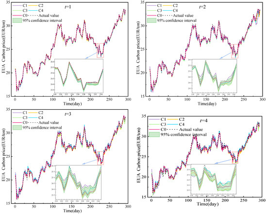 During sliding prediction, the model uses a 7 × N matrix from the time step immediately preceding point i to predict carbon prices for the interval from point i to i + t − 1, where t is the prediction step size. After each prediction, the model shifts the window to use a new 7 × N matrix from the time step before point i + t as the next input, enabling continuous rolling forecasts. Figure 10 illustrates the sliding window training and prediction process under different step sizes t.