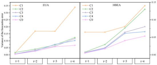 Variance of carbon price prediction errors for EUA and HBEA under different model schemes.