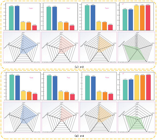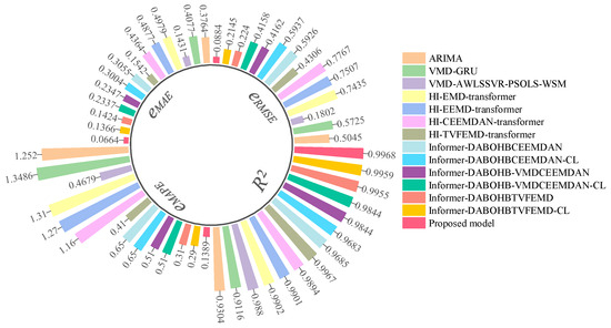 As shown in Figure 11, the predicted values from the proposed model closely align with the ground truth, with minimal fluctuations and positioning near the center of the 95% confidence interval for all comparative predictions. The predicted mean curve closely follows that of the true values, while eRMSE, eMAE, and eMAPE all exhibit a clear inward contraction, and R2 shows a pronounced outward expansion. These consistent trends confirm that the proposed model achieves the lowest prediction errors and the highest fit quality, demonstrating superior forecasting performance.
