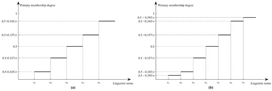 The relationship between language terms and primary membership degrees under a normal distribution for (a) L = 5 and (b) L = 7.