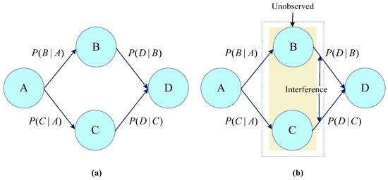 Because intermediate processes are unobservable in the QPT framework as depicted in Figure 4b, interference phenomena can occur among multiple possible paths. Hence, the final state can be viewed as a superposition of these distinct paths. The computation of the transition probability from an initial state A to a final state D requires summing the probability amplitudes associated with all potential paths from A to D to obtain the total probability amplitude. The probability is then derived by squaring the magnitude of this total amplitude: