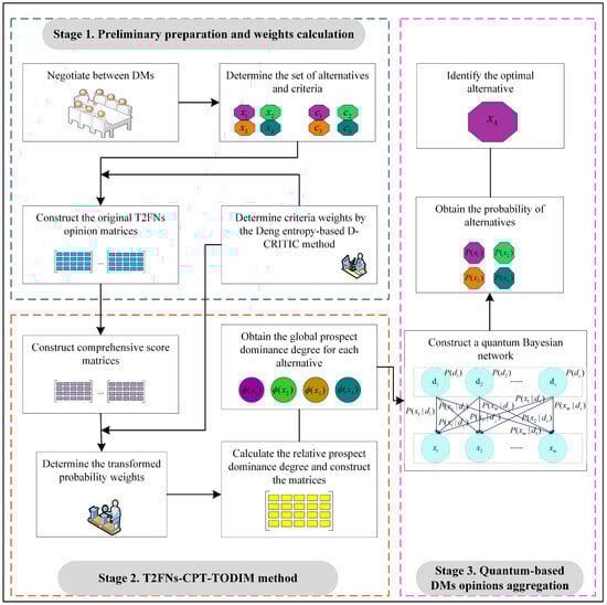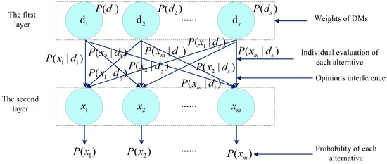 The resolution of MCGDM problems requires combining separate assessments from individuals using a particular method for aggregation. Extensive research has been dedicated to aggregation techniques in MCGDM. However, a common limitation is that most current methods are predicated on the assumption of mutual independence among the involved DMs, meaning that their opinions are not influenced by one another. Contrary to this idealized view, real-world instances frequently demonstrate that social and environmental factors easily influence individuals’ opinions. Conjunctive or disjunctive attitudes might be adopted by individuals regarding the opinions of different DMs in actual decision making. This inherently introduces the fact that the assessments provided by various DMs become susceptible to mutual influence, potentially impacting the final decision. This interplay brings forth the concept of “interference”, a fundamental element within QPT. As a recent theoretical progression [23,24], QPT advances upon classical probability theory. It features robust probability descriptive power coupled with a rigorous axiomatic framework, facilitating its widespread study and application in various fields. Among these are psychology [25,26], cognitive science [27], and decision analysis [28,29]. Significantly, QPT also resolves many long-standing paradoxes unresolved by classical probability theory, including the disjunction fallacy [30], the Ellsberg paradox [31], and the order effect [32]. It is noteworthy that QPT offers a natural mechanism for reflecting interference terms. This inherent capability makes QPT a highly suitable and theoretically grounded means to explore the interference effects that manifest between DMs’ opinions in MCGDM applications. Consequently, leveraging QPT to model these interference effects within the decision-making process is considered an objective and rational approach.
