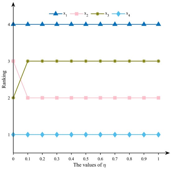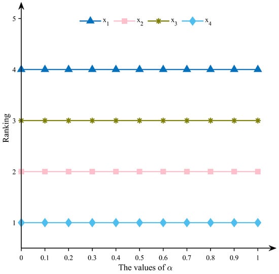 (2) Similarly, to evaluate the influence of parameter on the ranking outcomes, is varied from 0 to 1 in increments of , while other parameters are held constant. The corresponding results are presented in Figure 9. These results indicate that, for , alternative outperforms . However, for all other tested values of , outperforms .