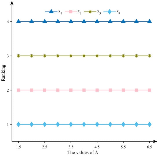 (3) To assess how the ranking of alternatives responds to the parameter , we systematically vary its value from 1.5 to 6.5, in steps of 0.5, holding other parameters fixed. The ranking outcomes for alternatives and , as determined across the entire range of , are clearly depicted in Figure 10. It can be observed that the ranking order exhibits complete robustness to changes in the value of . Specifically, the ranking order consistently remains .