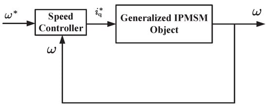A cascade framework is usually used for motor control in industrial applications. In this framework, the speed loop control and current loop control can be designed separately. For the sake of convenience, here, we treat the current closed-loop control of the IPMSM as a whole, based on the cited reference, while designing the speed loop controller independently. Figure 1 shows this framework, where the generalized IPMSM object represents an integrated system encompassing the current loop controller, the IPMSM, and the power electronics units, and the speed is regulated by a speed controller designed in this study. In Figure 1, represents the reference speed, and represents the reference q-axis current.