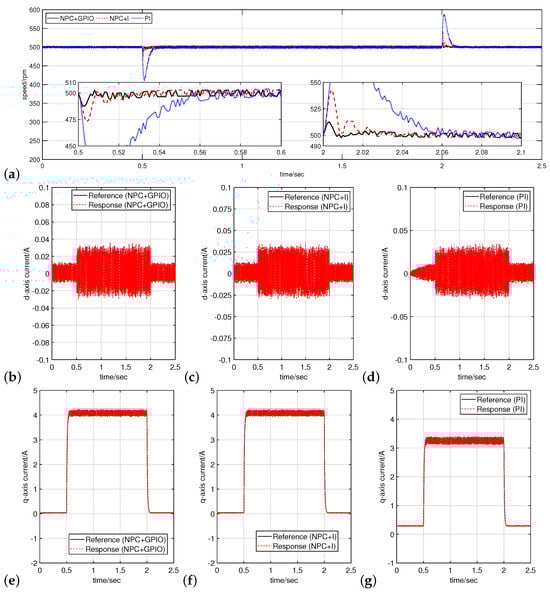 Comparison of waveforms for three speed controllers (NPC + GPIO, NPC + I, and PI) at a given speed of 500 rpm (with the low- and medium-speed range degraded to control) (dynamometer loading: 2.4 N·m): (a) Comparison of speed response waveforms for the three speed controllers; (b) d-axis current response waveform under NPC + GPIO speed controller; (c) d-axis current response waveform under NPC + I speed controller; (d) d-axis current response waveform under PI speed controller; (e) q-axis current response waveform under NPC + GPIO speed controller; (f) q-axis current response waveform under NPC + I speed controller; (g) q-axis current response waveform under PI speed controller.
