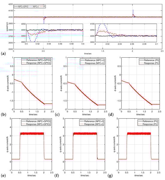 Comparison of waveforms for three speed controllers (NPC + GPIO, NPC + I, and PI) at a given speed of 4000 rpm (high-speed range with field-weakening control) (dynamometer loading: 1.5 N·m): (a) Comparison of speed response waveforms for the three speed controllers; (b) d-axis current response waveform under NPC + GPIO speed controller; (c) d-axis current response waveform under NPC + I speed controller; (d) d-axis current response waveform under PI speed controller; (e) q-axis current response waveform under NPC + GPIO speed controller; (f) q-axis current response waveform under NPC + I speed controller; (g) q-axis current response waveform under PI speed controller.