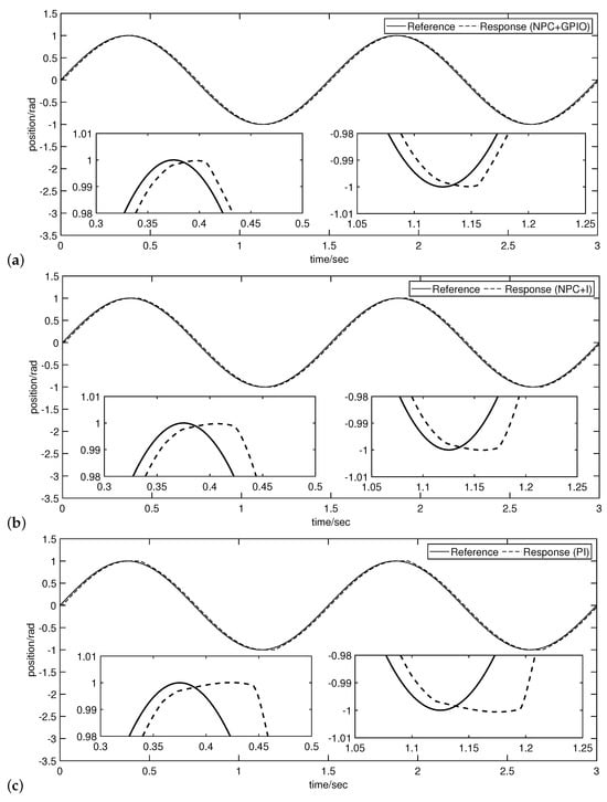 Comparison of position response waveforms under the given position sinusoidal command (1 rad; 0.667 Hz) for three speed controllers (NPC + GPIO, NPC + I, and PI): (a) NPC + GPIO; (b) NPC + I; (c) PI.