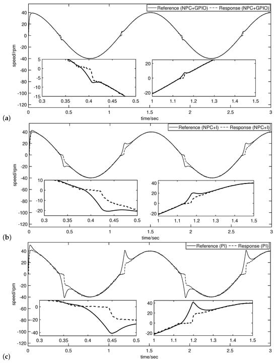 Comparison of speed response waveforms under the given position sinusoidal command (1 rad; 0.667 Hz) for three speed controllers (NPC + GPIO, NPC + I, and PI): (a) NPC + GPIO; (b) NPC + I; (c) PI.