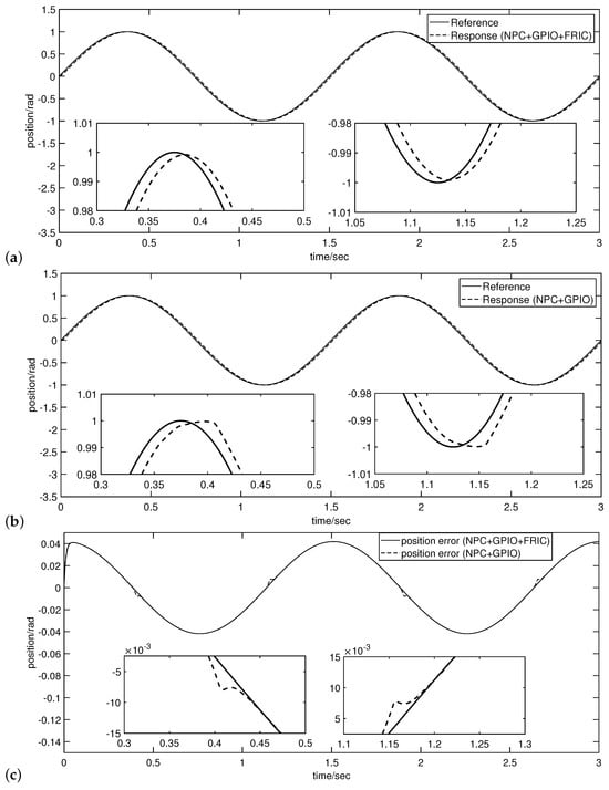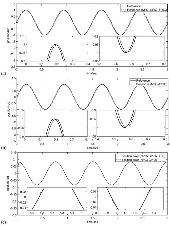 Comparison of position response waveforms under parameter-varying conditions with the given position sinusoidal command (1 rad; 1.333 Hz) for two speed controllers (NPC + GPIO + FRIC and NPC + GPIO): (a) NPC + GPIO + FRIC; (b) NPC + GPIO; (c) position tracking error for both controllers.