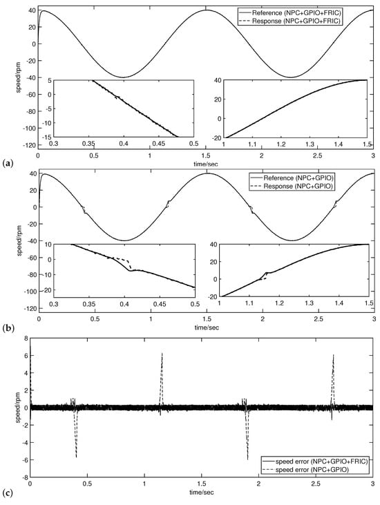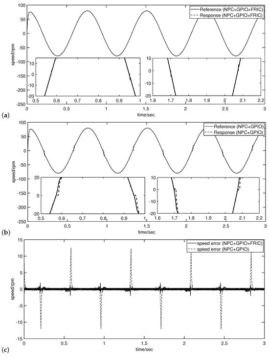 Comparison of speed response waveforms under parameter-varying conditions with the given position sinusoidal command (1 rad; 1.333 Hz) for two speed controllers (NPC + GPIO + FRIC and NPC + GPIO): (a) NPC + GPIO + FRIC; (b) NPC + GPIO; (c) Speed tracking error for both controllers.