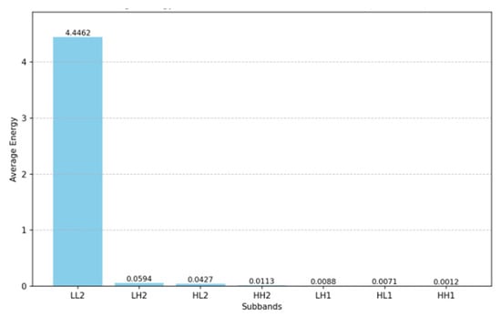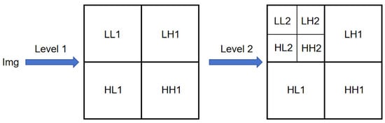 In digital image processing, high-frequency components typically carry detailed information, such as textures and noise, while low-frequency components preserve the fundamental structure and contours of an image. This characteristic makes subtle modifications in high-frequency bands particularly imperceptible to human vision. Leveraging this principle, we performed a two-level discrete wavelet transform (DWT) on the chrominance channels , specifically employing the Daubechies 2 (db2) wavelet basis. This decomposition was derived from Equation (2):