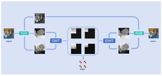 The proposed methodology achieves covert yet efficient backdoor implantation by injecting polarity-alternating triggers into high-frequency sub-bands of chrominance channels during wavelet transformation. As illustrated in Figure 2, the comprehensive pipeline consists of four key steps: (1) YUV color space conversion, (2) wavelet decomposition of UV channels, (3) high-frequency sub-band trigger injection, and (4) image reconstruction. This systematic approach ensures optimal trigger embedding while preserving visual quality and model functionality. Inter-step relationships: The pipeline follows a hierarchical progression—color space conversion enables targeted channel processing, wavelet decomposition localizes embedding regions, the design and injection of polarity-alternating triggers optimize both stealth and effectiveness, while reconstruction ensures end-to-end compatibility. Collectively, these steps achieve an optimal balance between attack efficacy and imperceptibility.
