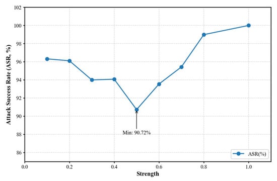 Figure 5 demonstrates the quasi-linear relationship between attack success rate (ASR) and trigger intensity α. Notably, when α > 0.8, ASR stabilized at 98.3% ± 0.4%, indicating that strong triggers effectively surpassed the model’s frequency-domain feature extraction threshold. Remarkably, even in the weak intensity range (α ∈ [0.1, 0.4]), ASR maintained a high level of 94.6% ± 1.2%, validating the specific activation effect of high-frequency sub-band injection on shallow CNN convolutional kernels. However, an anomalous inflection point occurred at α = 0.5 (90.72% ± 1.8%), attributable to dynamic cognitive mechanisms in the model—at this critical threshold, trigger energy was partially recognized as potential noise rather than semantic features by certain convolutional kernels, resulting in sparse activation of feature maps.