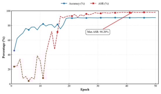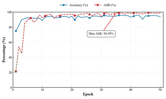 ASR (attack success rate): The percentage of triggered samples misclassified as the target class. A successful attack requires high ASR (ideally ≈ 100%) while maintaining high ACC: