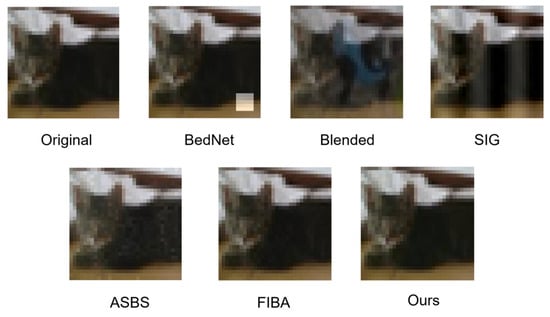 As shown in Table 3, we evaluated our method on two widely used backdoor attack benchmarks, CIFAR-10 [] and GTSRB [], using a ResNet-18 model. Comprehensive experiments were performed, comparing our approach with five state-of-the-art backdoor attack methods to validate its effectiveness and robustness.