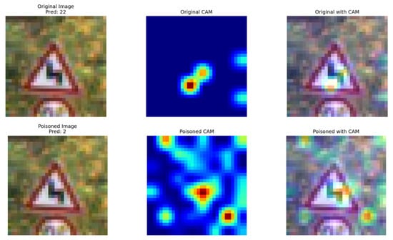 Comparison of Grad-CAM images (top image is original image, bottom image is poisoned image).