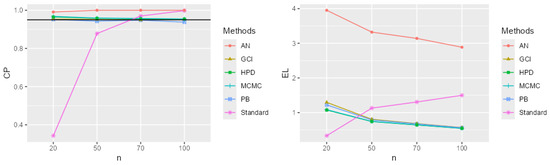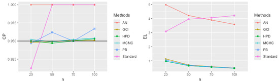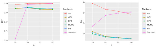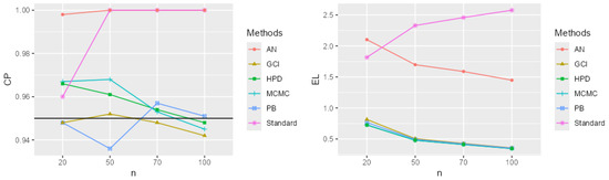 Therefore, the single mean is calculated using Equation (2), and the estimation of the credible intervals for the single mean of the zero-inflated Rayleigh distribution based on Bayesian MCMC for the two-sided case is given by Equation (20):