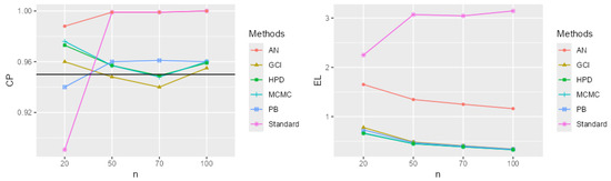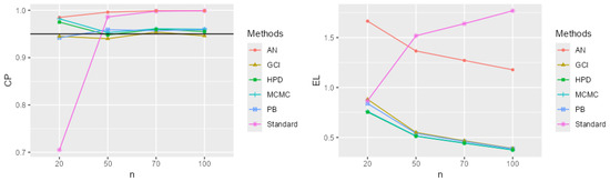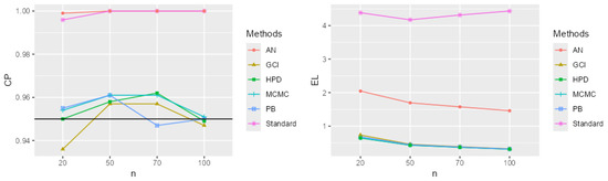 The performance comparison of confidence intervals for the zero-inflated two-parameter Rayleigh distribution, based on simulations using CP and EL values from Table 1 and Table 2 and Figure 2, Figure 3, Figure 4, Figure 5, Figure 6, Figure 7, Figure 8, Figure 9, Figure 10, Figure 11, Figure 12 and Figure 13, focuses on the confidence intervals of the single mean, with scale parameters and location parameter . The standard confidence interval based on maximum likelihood provides coverage probabilities lower than the nominal confidence level and exhibits a larger expected length compared to other methods, especially for small sample sizes. The approximate normal method using the delta method yields higher CP values than the standard method but also results in greater expected lengths. The expected length generally decreases as the sample size increases across most methods. The simulation results across various scenarios indicate that the Bayesian method outperforms the others in estimating the single mean when evaluated based on CP and EL. Additionally, the Bayesian HPD interval offers the shortest credible interval length.