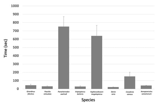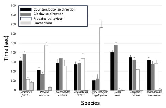 A one-way ANOVA showed a significant main effect of species on freezing behavior (F(7, 164) = 19.295, p < 0.001, partial η2 = 0.462, Figure 3). The post hoc analysis (Table 5) indicated that H. megalopterus and P. reticulata spent significantly more time freezing than other species.