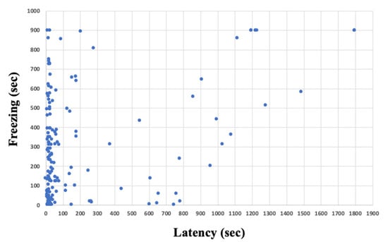 A significant positive correlation was observed between the latency to explore the environment and freezing during exploratory behavior (r = 0.398, p < 0.001).